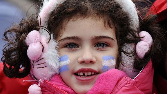 Una niña pintada con los colores argentinos asiste al encuentro entre el equipo local y España